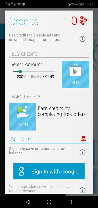 - Credits help users to disable ads and also download images from the library. Users will get credits by completing different tasks and missions in the app.