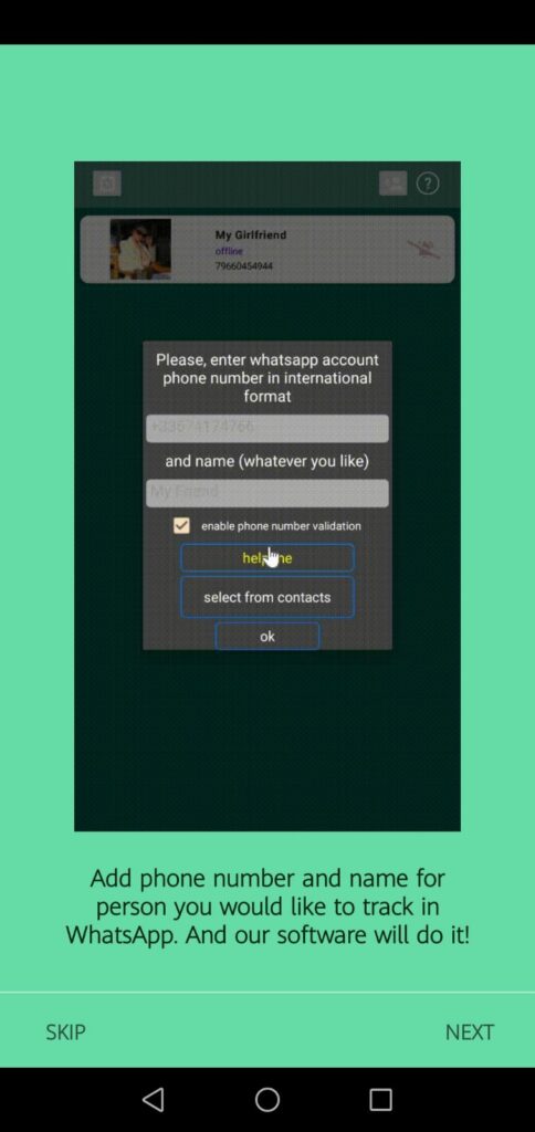 If you want to track any whats number then choose the add number option from the above menu list and enter the number in international format. Once you enter the number the app software will detect it and start to keep an eye on the added number.