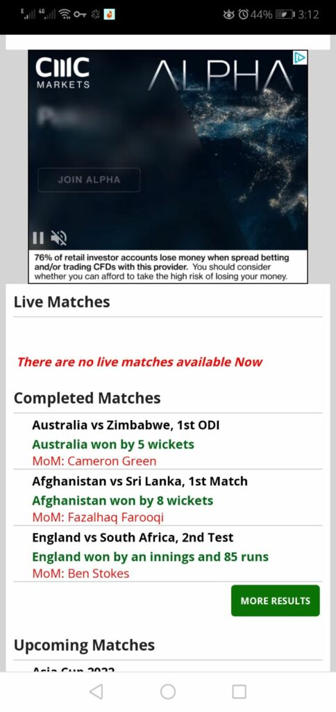 If you want to watch live matches then choose the live cricket option and watch both ongoing and upcoming matches live for free. To know the live score choose the score option from above lust.