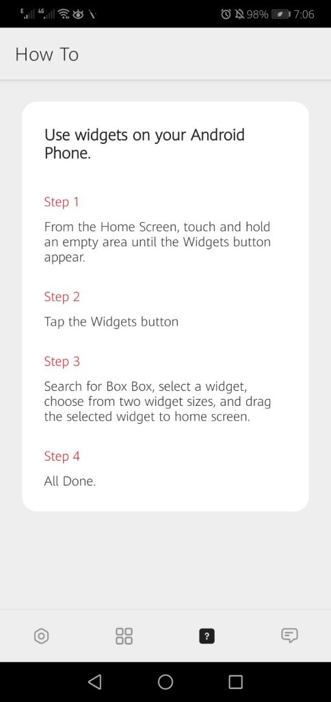 Now tap on the widget button and then start searching for Box Box Widget App. Once you see this app in your search results now select it and then choose the widget which you want to add to your home screen.