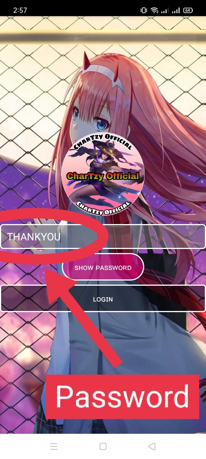 After installing char tzy modz App now open it by a tap on the app icon and you will see the main page where you need to enter a password to access all built-in ML hacks and scripts.