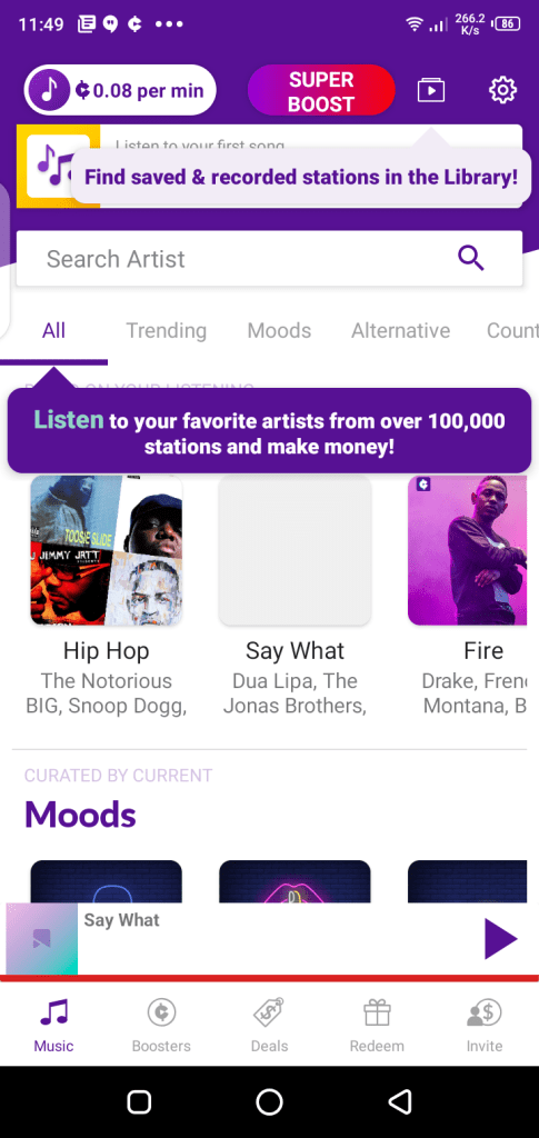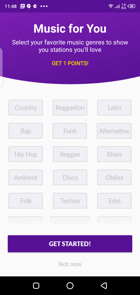 - This app helps the user to earn points by listening to music that they can redeem for real money.