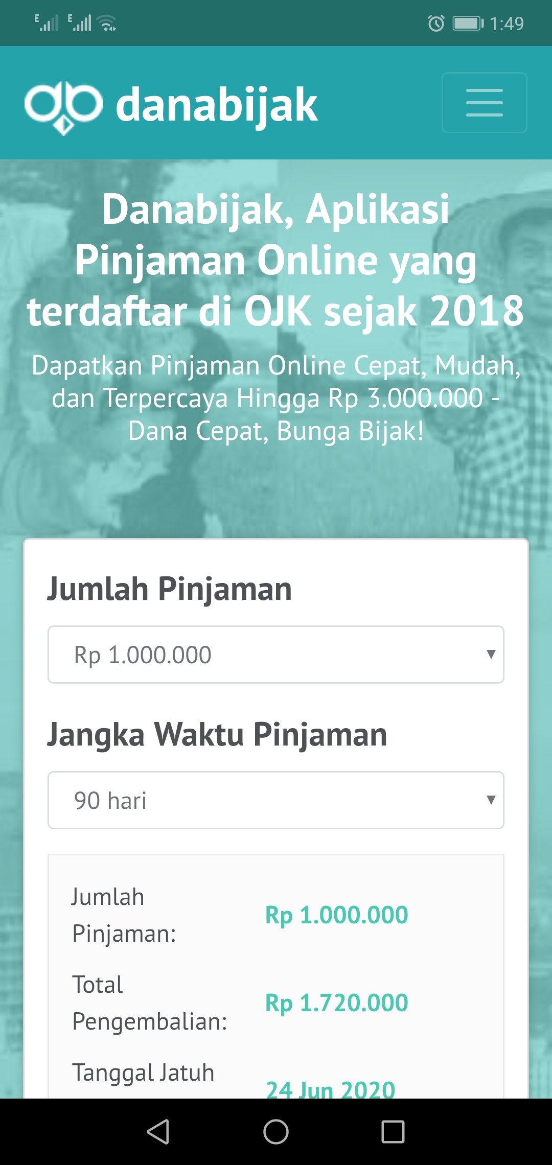 You can get maximum loan money up to Rp 1,000,000 for 120 days. The total money return for this amount is IDR 1,168,000 till Apr 16, 2020. Before applying for a loan read all terms and conditions carefully to get all information about the loan and its installments and other procedures.