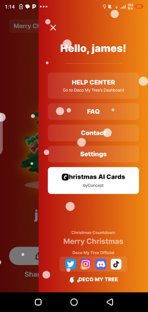 After installing the app open the Christmas tree decoration app by tapping on the app icon shown on your screen. Once you open the app you will see a landing page where you will be welcome to Deco My Tree with the below-mentioned options.
