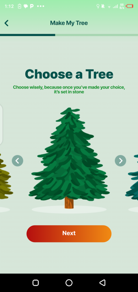 After entering the name you will see another tab where you will see more than 20 different Christmas trees of a different colour. Choose your desired colour tree which you want to decorate by tapping on it.