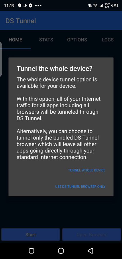 - This option is used to protect your whole device. Once you choose this option all your internet traffic for all apps, browsers, or anything else will be a tunnel through the DS tunnel which checks all your traffic for viruses, bugs, malware, etc.