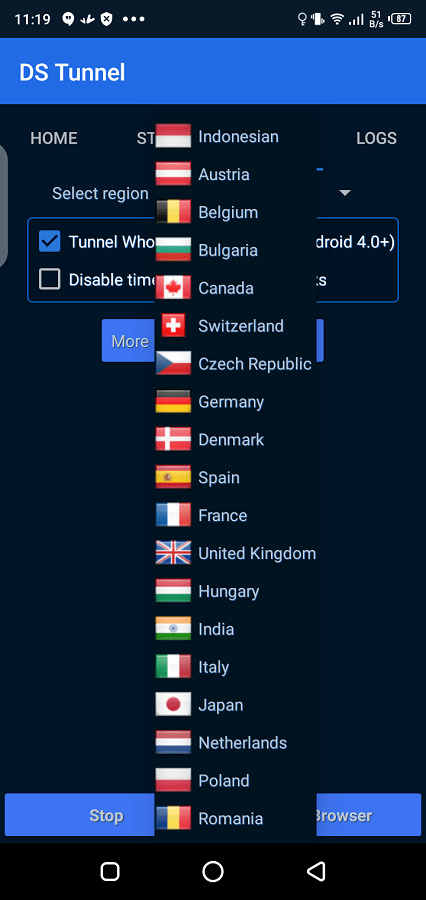 To change country server, select options from above, and you will see a server list from where you can easily choose any server by a tap on it. Once you choose a server it will automatically connect to your device. To stop this VPN app tap on the stop option.