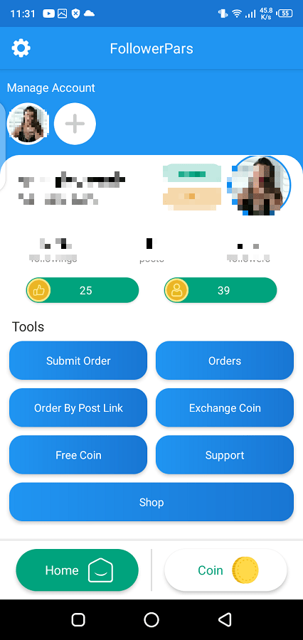 Once you successfully log in to your Instagram account through this app you will get 10 followers and 10 general coins in your account as a daily gift. Now you see the main dashboard of the app with the below-mentioned options,