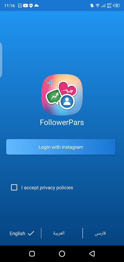 After installing the app open it and you will see the main page where you need to choose your desired language and also accept the terms and conditions to access this app. Once you accept the terms and conditions you will see a new tab where you need to log in to the Instagram account on which you want to get free engagements.