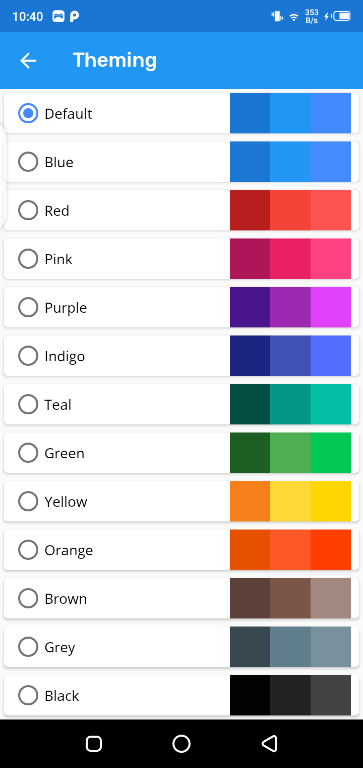 Default, Blue, Red, Pink, Purple, Indigo, Teal, Green, Yellow, Orange, Brown, Grey, Black, and many more different color themes.