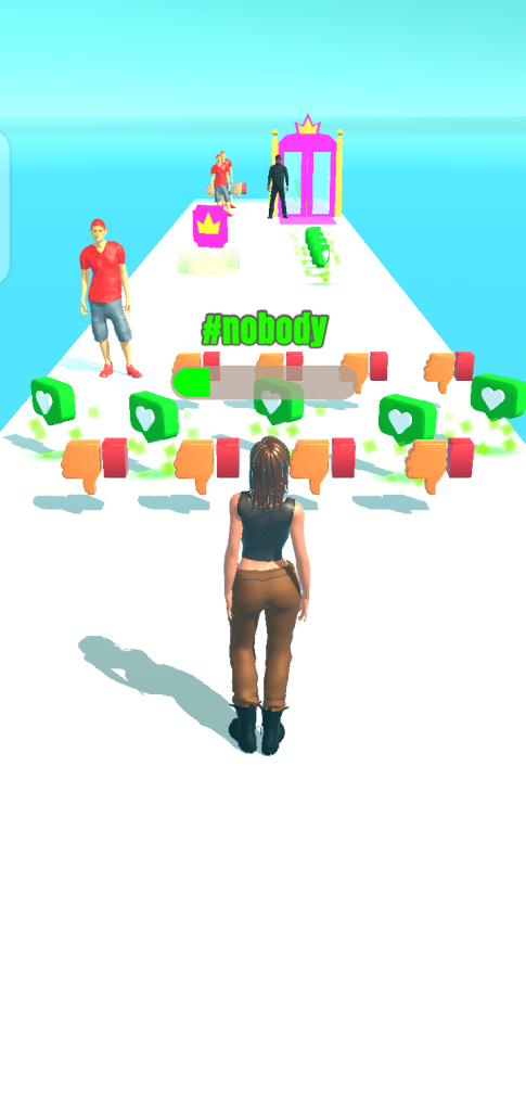 - Swipe left and right while running to collect hearts, likes to become famous.