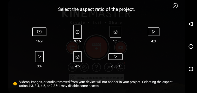 After installing the kinemaster pro mod apk open it by tapping on the app icon and you will see the main dashboard where you need to select the aspect ratio of the project from different ratios.