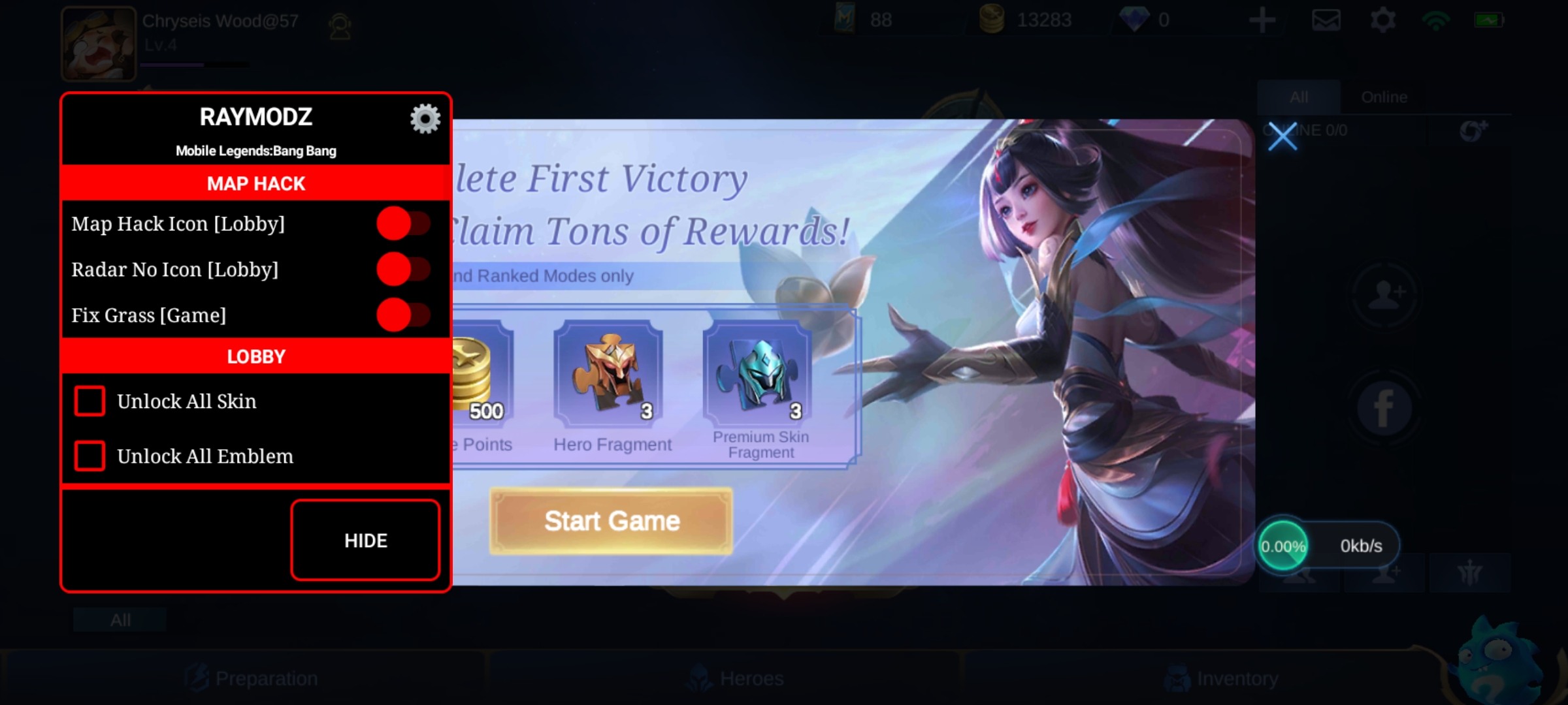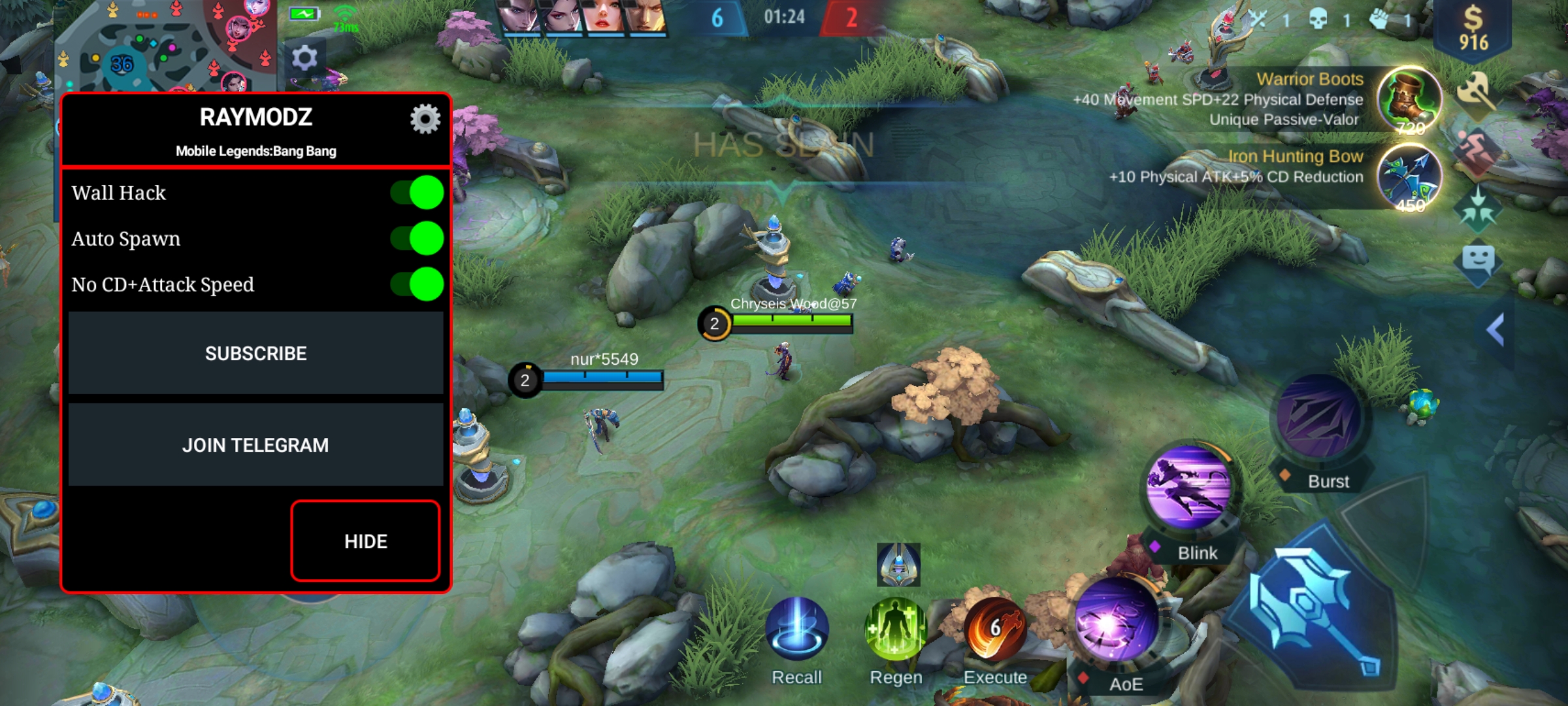 • In this custom category, MLBB players get tons of different Radom hacks which provide players with the upper hand while playing the game. We have shared some hacks like, Wallhack, Auto Spawn No CD+ Attack Speed, etc. which you will get in this custom tab.