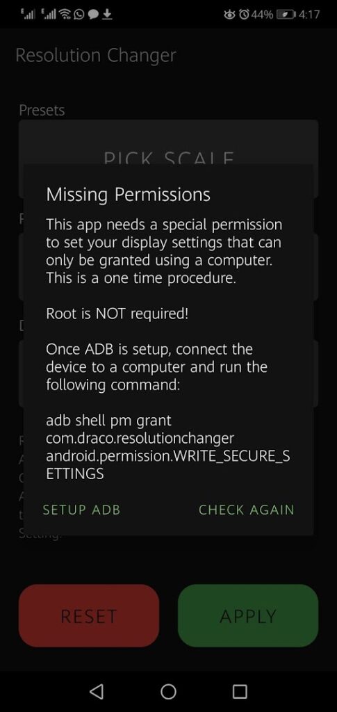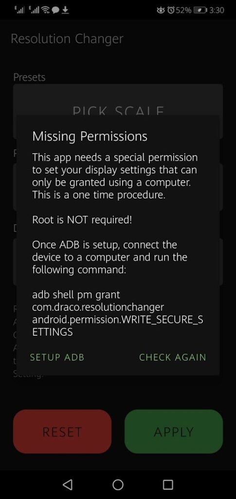 - Com.draco.resolutionchangerandroid.permission.WRITE_SECURE_SETTINGS
