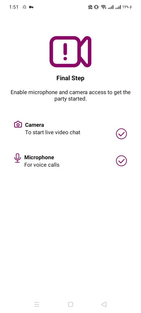 After choosing gender now tap on the continue button again and you will see a new page where you have to enable microphone and camera access to get the party started. After enabling both features you will see a new page with below mention message.
