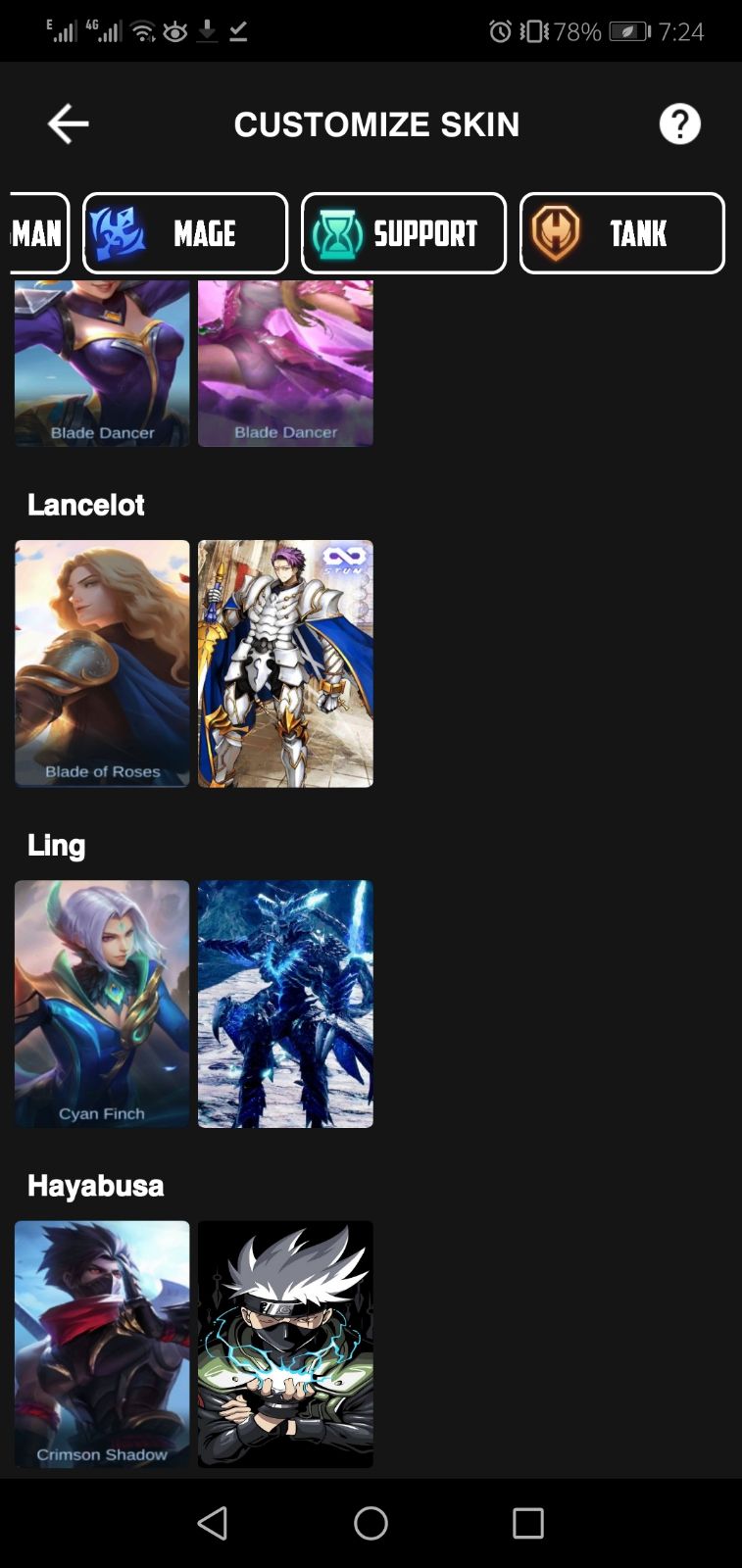 - Alucard, Aldous, Alpha, Argus, Bane, Balmond, Badang, Chou, Dyroth, Freya, Guinevere, SilvanaLeomord, Themuz, Masha, Martis, Minsitar, Lapu, Kaja, Roger, Ruby, Sun, Terizia, Zilong, Jawheadetc.