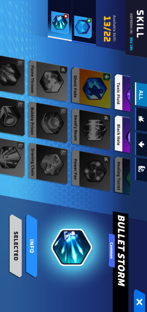 - Crazy Charge, Ice Ball, Toxic Fluid, Burrow, Black Hole, Bubble Prison, Droning Chain, Bullet Volley, Rocket Plunger, Meteor.