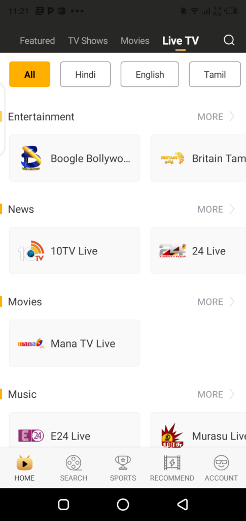 - As the name indicate this tab contains live sports, matches, and schedules for famous sports like cricket, football, basketball, and many more.
