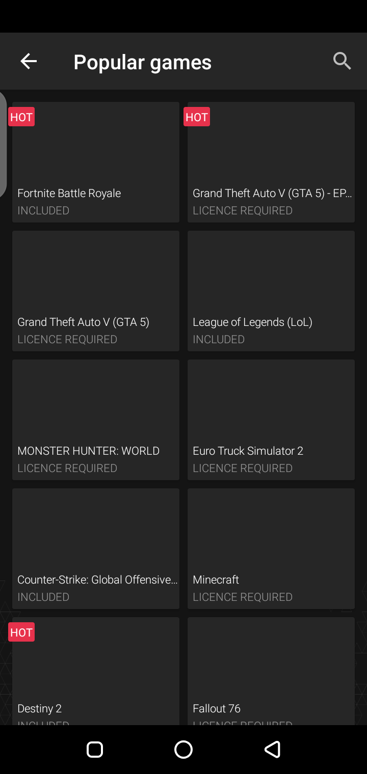 You can get easily all famous games on this app like Fortnite Battle Royale, Grand Theft Auto v GTA 5, League of Legends, Monster Hunter, euro truck simulator 2, Counter-Strike, Minecraft, Destiny 2, fallout 76, magic, Apex Legends, team fight tactics, far cry 5, dota 2, brawhalla, left 4 dead 2 and many more.