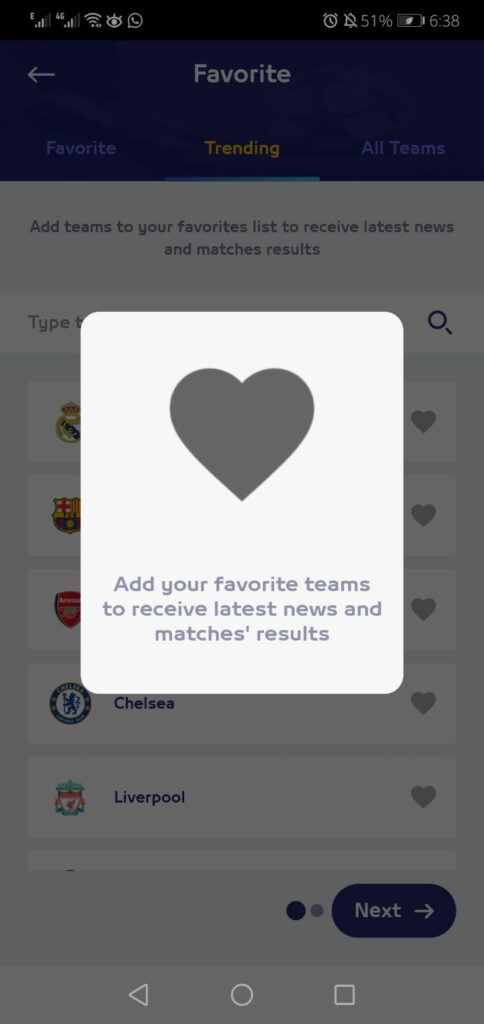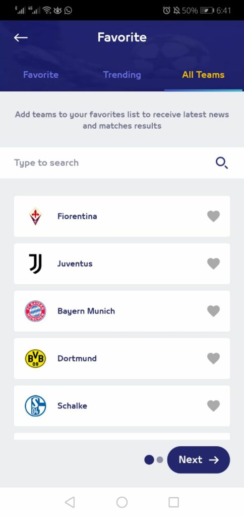 While installing the app allow all permissions and also enable unknown sources from the security setting. After installing the app open it and you will see the main dashboard of the app where you have to choose a list of your favorite teams and then proceed further where you will see the below-mentioned menu list,